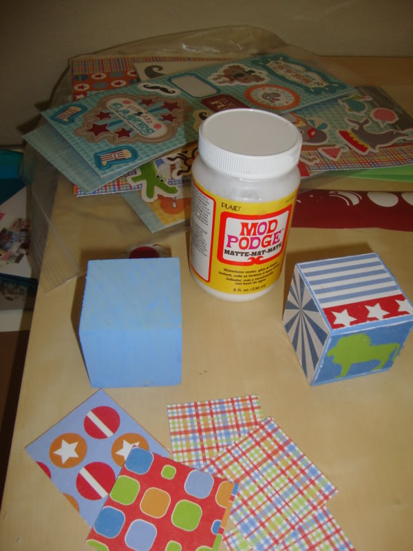 2. Cut paper into two inch squares. Distress the edges. Apply to wood blocks with Mod Podge.