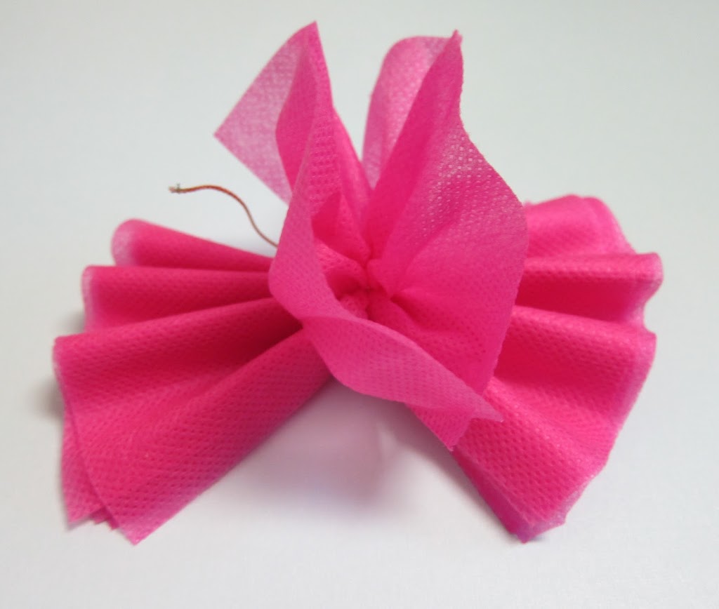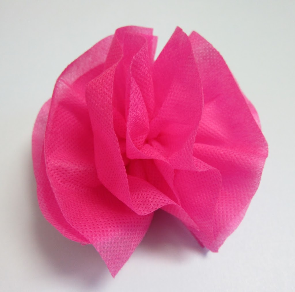 Step four: Start with the top layer, and pull up both sides of the fabric. Continue until you have puffed up the flower. Adjust and trim as needed. Make 6-8 flowers.