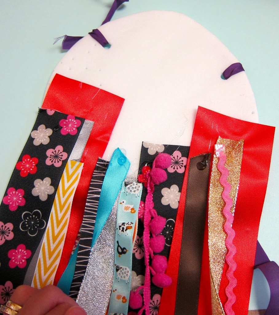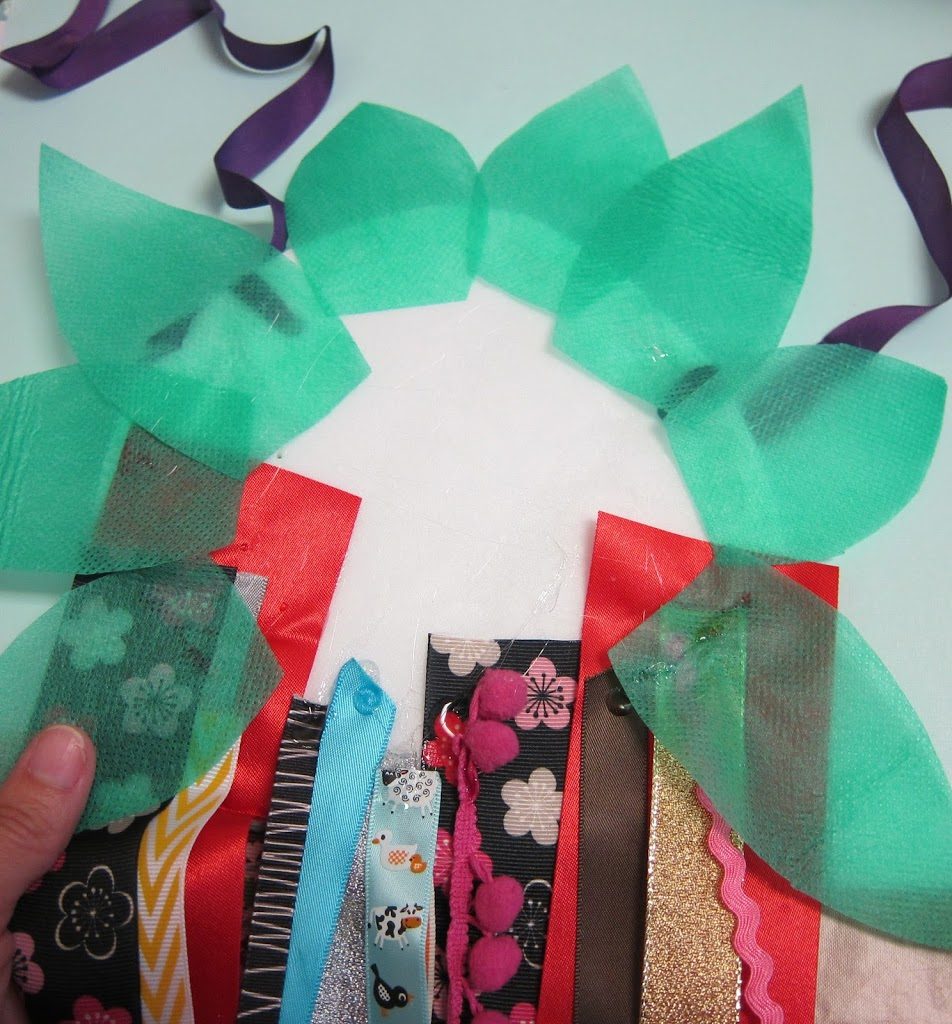 Step six: Hot glue ribbon to the bottom of the circle. The more ribbon, the better. Cut leaves from green Oly*Fun and glue those on, too.