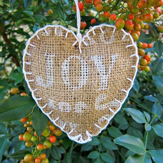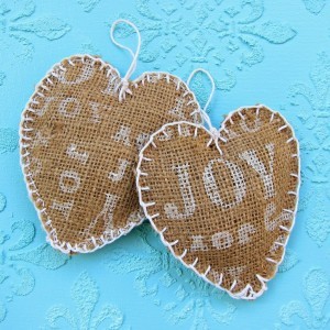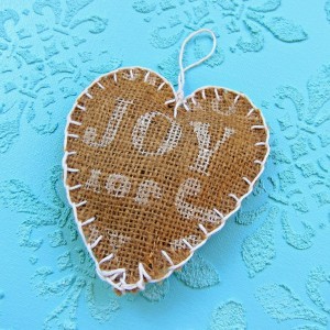 Step one: Use different sized alphabet stamps to spell the word “joy”. Sponge the stamp with white craft paint, and press it onto the burlap fabric. Repeat as desired.