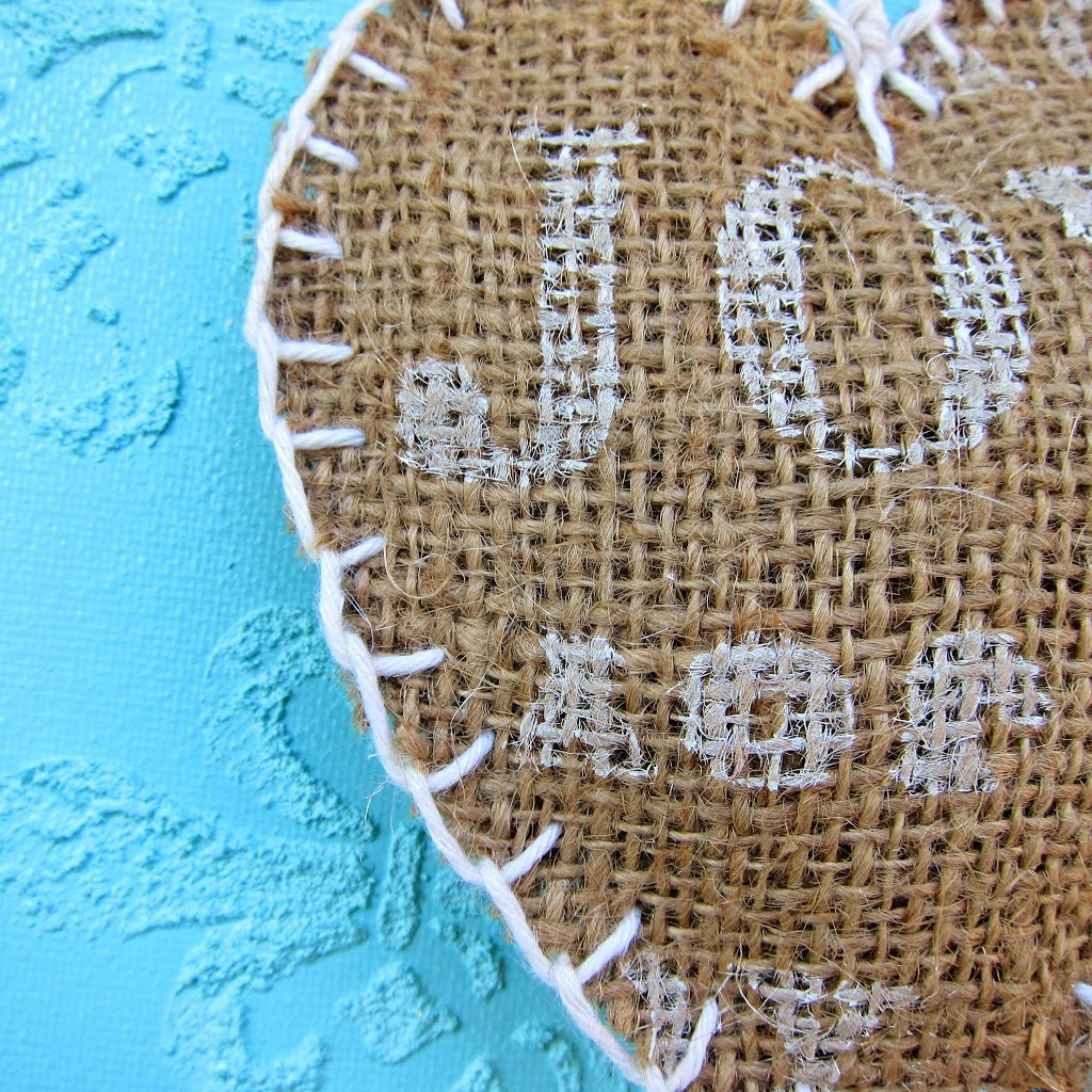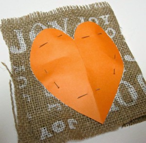 Step two: Make a heart template out of cardstock. Trace it onto the burlap and cut out two hearts.