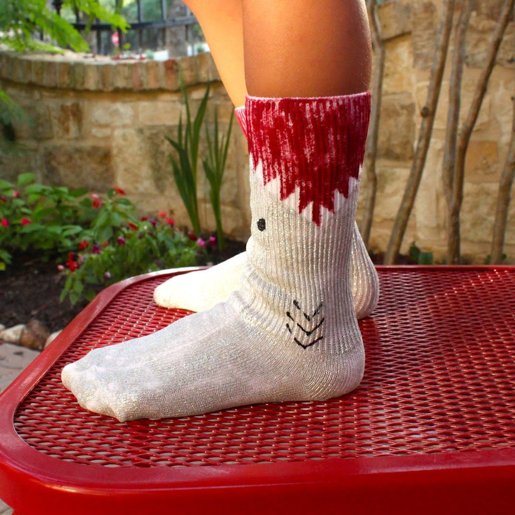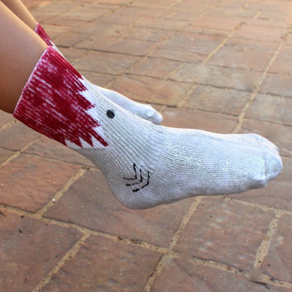 Hooray, it’s shark week! You know I can’t pass up the chance to make a shark themed project for this annual summer “event”. I’ve made shark themed jewelry and a shark shaped jewelry hanger, and I’m back this year with another idea. Shark projects can run the spectrum from scary to silly to chic, and the idea I have for you today definitely falls in the “silly” category, with a nod to how scary sharks are. Let’s make shark socks!
