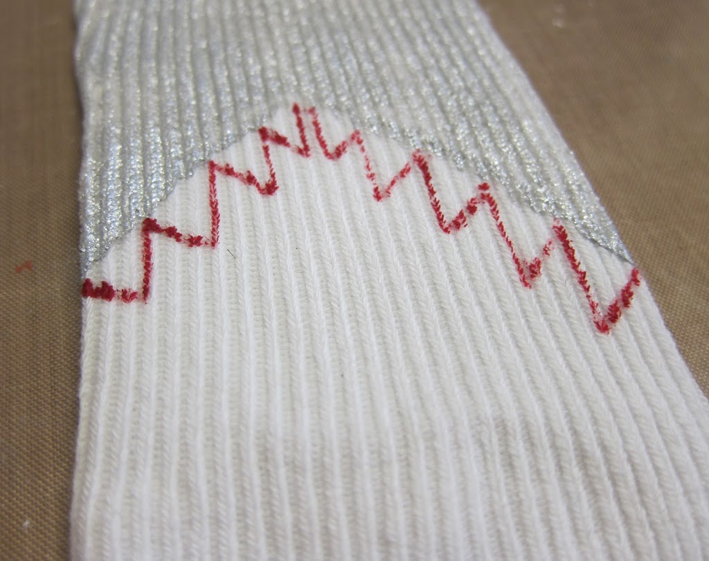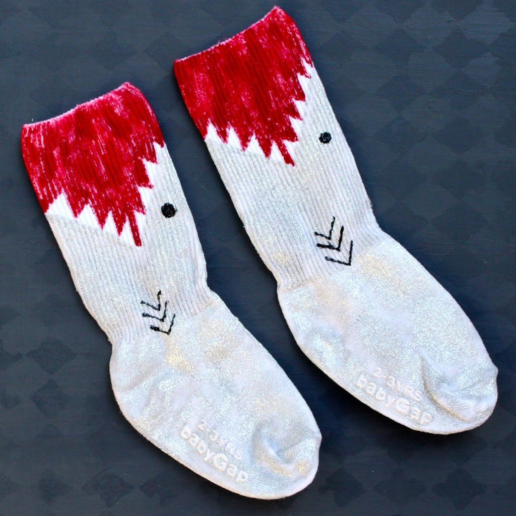 Step three: Use the red paint to outline the teeth. Make small “v” shapes for the teeth. Fill the top of the sock with the red paint. Looks bloody gross, doesn’t it? I’m sorry!
