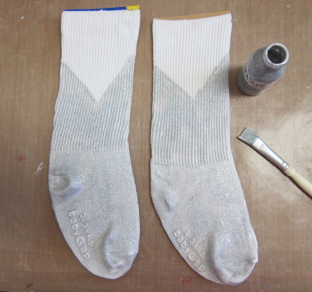 Step two: Use the silver paint to make the “body” and “head” of the shark. Paint a “v” shape near the top and fill in the rest of the sock with silver paint. Repeat on the other side of the shark. I love the soft metallic shine that this paint has!