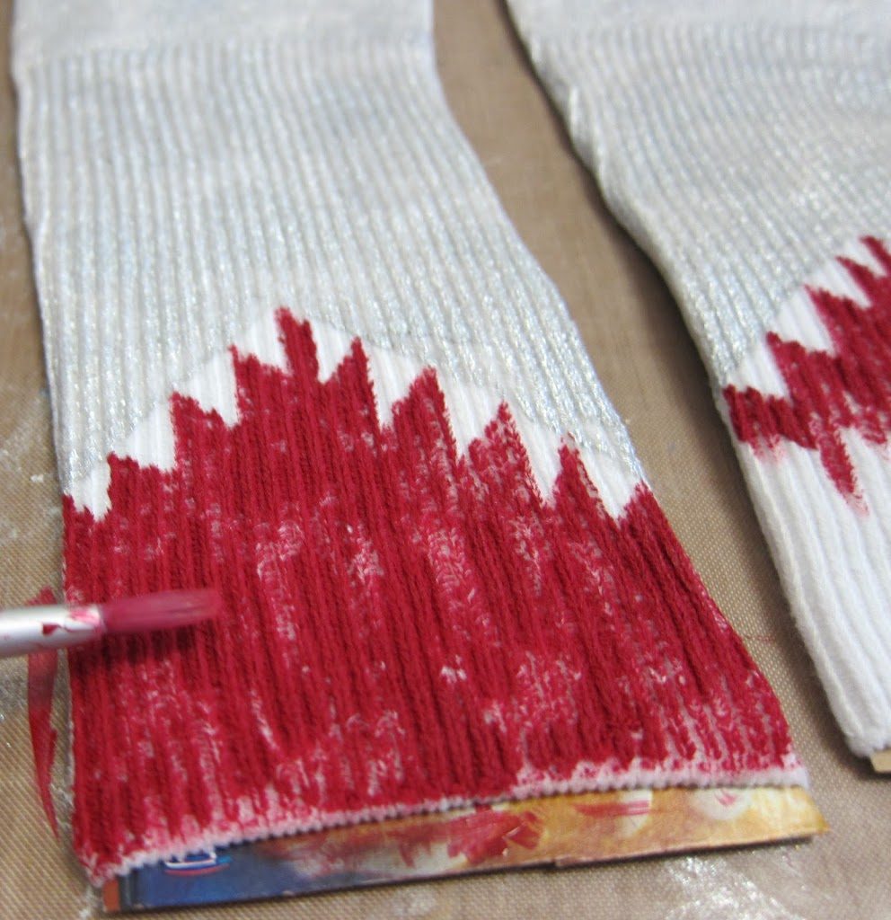 Step one: Cut a piece of cardboard so that it fits inside the sock. This will not only make the socks easier to paint, but it will also keep the paint from seeping through to the reverse side.