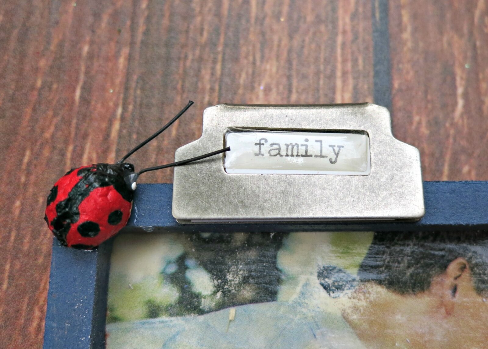 Step three: Paint the front of the frame and glue it on. Embellish it as desired with various elements. I added some whimsy by combining the Tim Holtz lock and tag with some flowers and cute miniatures.