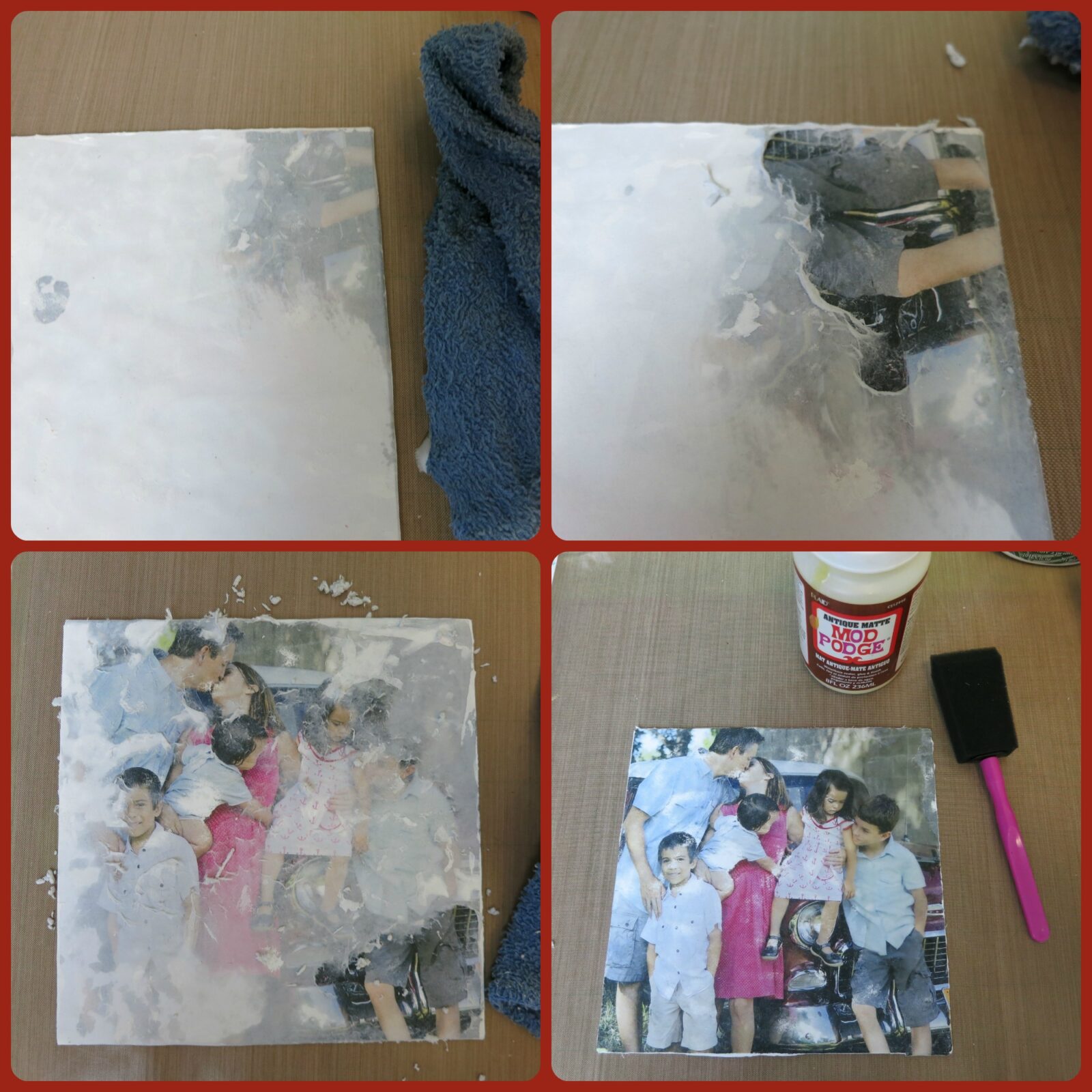 Step two: Use a damp washcloth to wet one section of the paper at a time. Gently rub the paper away with the washcloth to expose the image underneath. Continue until the entire transferred image is visible. Once you’re happy with the final image, seal it with Mod Podge.