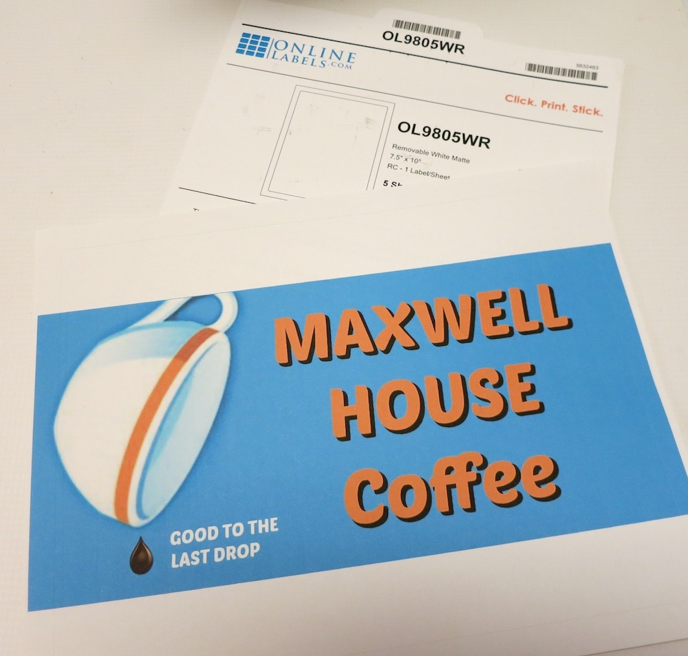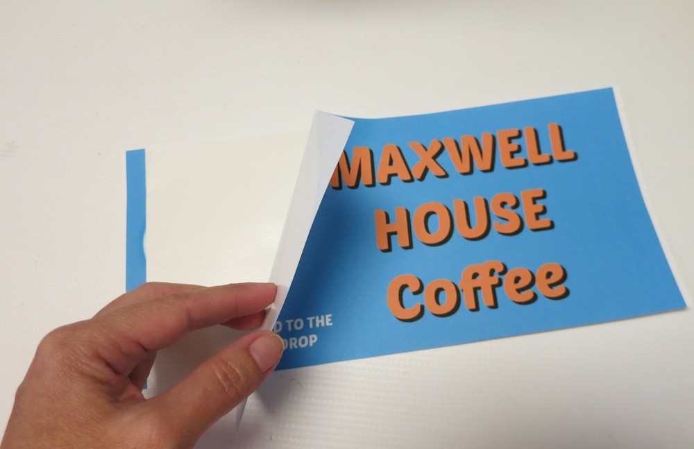 Print the coffee can sticker onto the printable label paper. I love to use full sheet sticker labels from OnlineLabels.com because I can print my own designs and stick them on almost anything without waiting for glue to dry. Just print and stick! Peel it off the backing and stick it on the container.