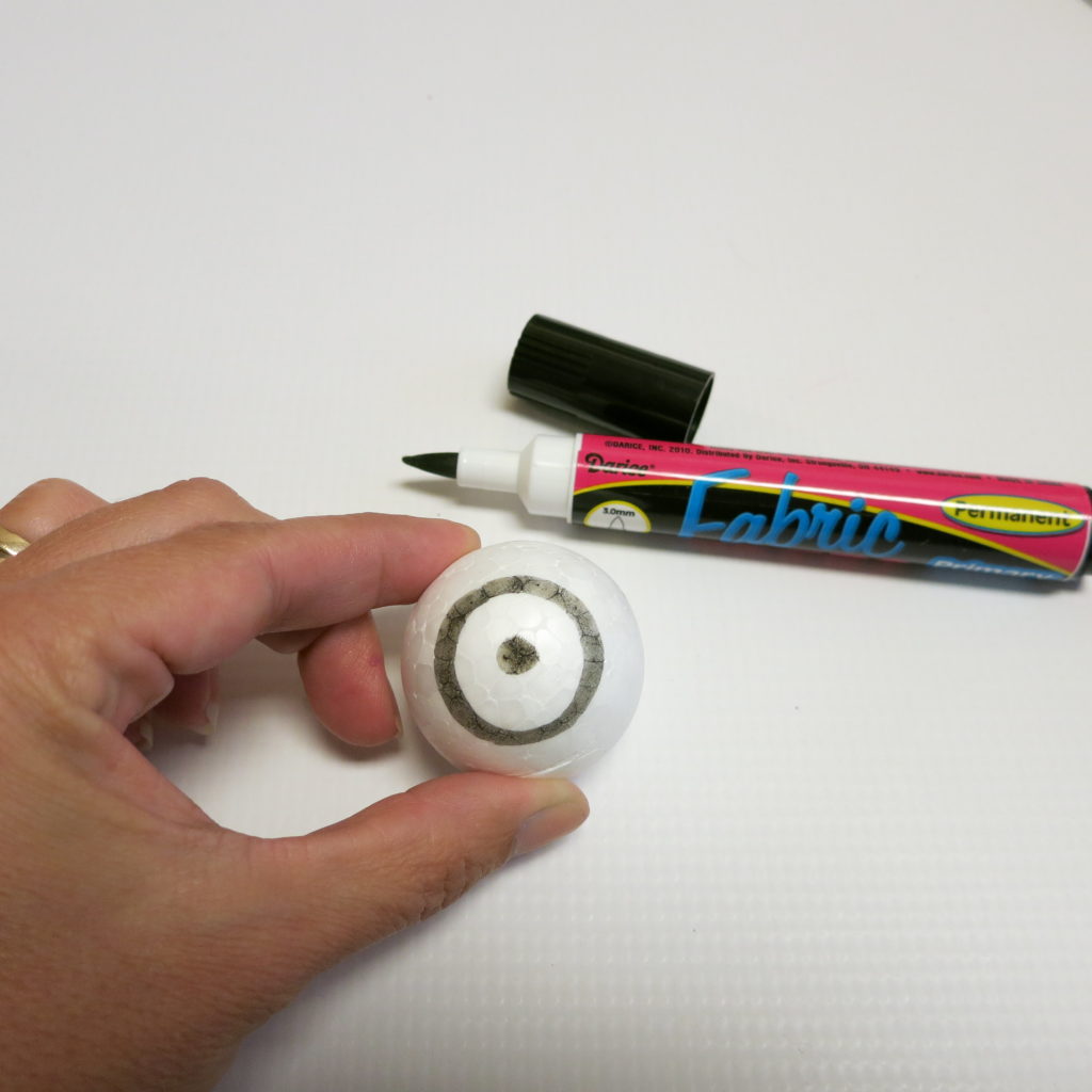 Step two: Use the black fabric marker to draw a circle on the Styrofoam ball. Make a smaller circle inside the larger circle as pictured.